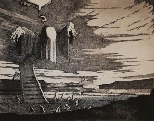 大正6年12月23日熊本県上益城郡の生まれ、東京芸術大学油画科卒業、戦争体験をテーマとした初年兵哀歌シリーズが代表作である。エッチング特有の白黒の陰影の表現がそのまま心の陰影をうまく表現することができた。当時、駒井哲郎の銅版画が評判を呼び、その技法に興味を持って制作を始めたが、少年時代に画集を見て興味を覚えたゴヤの戦争の惨禍などのエッチングへの関心がひそかに起きていたことが推測される。