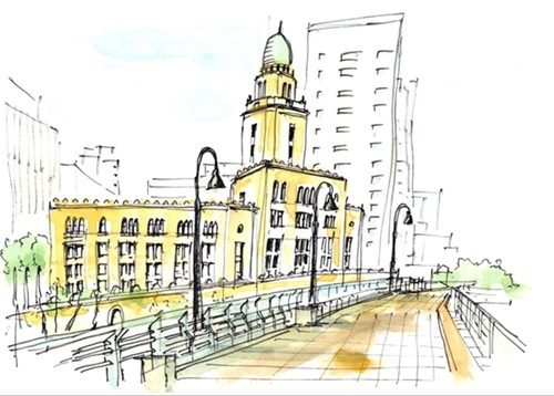 います。水性耐水ペンと透明水彩絵具を使った淡彩スケッチ画を描いて