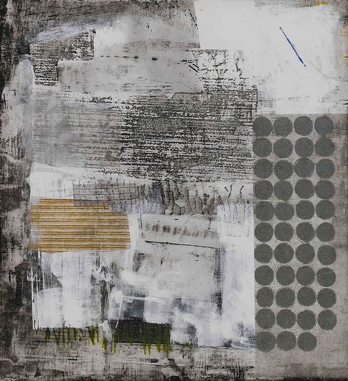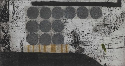 私の近年の木版画による作品は「流動、集積への興味から」と位置付け、小さな点や飛沫、筆で描いた掠れや滲みのある線、