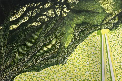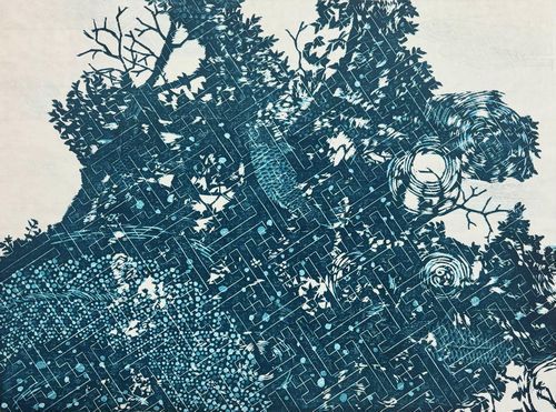 彫り進め集積する形をつくることから「綴り彫り」と称しています。作者の意図しない見方も含め、皆様には木版画の前に立ち、鑑賞いただけますと幸いです。